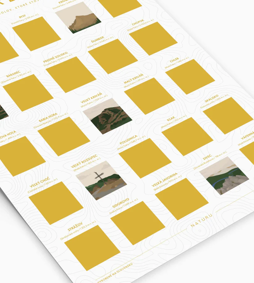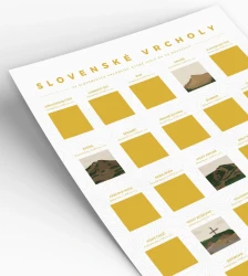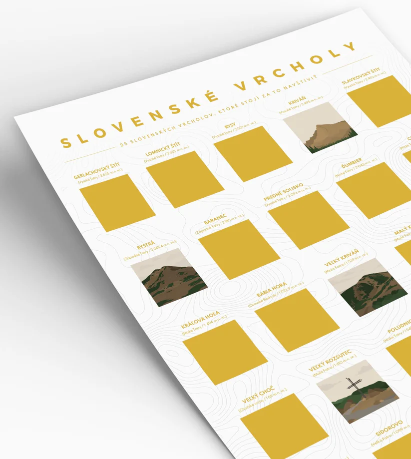Stierací plagát vo formáte A3 urobí radosť každému milovníkovi turistiky. 25 stieracich políčok ukrýva originálne ilustrácie, ktoré vás zavedú na 25 najkrajších slovenských vrcholov. Tento stierací plagát funguje ako skvelá motivácia či zoznam nápadov na výlety po slovenských horách. Stierací plagát odosielame v krabičke s ochranným papierom, aby sa k vám dostal bez akýchkoľvek poškodení.So stieracím plagátom Slovenské vrcholy budete mať o nápady na výlety po Slovensku postarané. Pod 25 stieracími políčkami vás čakajú neprehliadnuteľné ilustrácie tých najznámejších a najvyhľadávanejších slovenských vrcholov. Vysoké Tatry, Nízke Tatry, či Malá a Veľká Fatra. To je len časť pohorí, ktorých vrcholy sme ukryli na tomto originálnom stieracom plagáte. Navštívte jednotlivé miesta na plagáte a svoju návštevu zaznamenajte zotretím stieracieho políčka – na spomienku či oslavu ďalšieho zdolaného miesta.